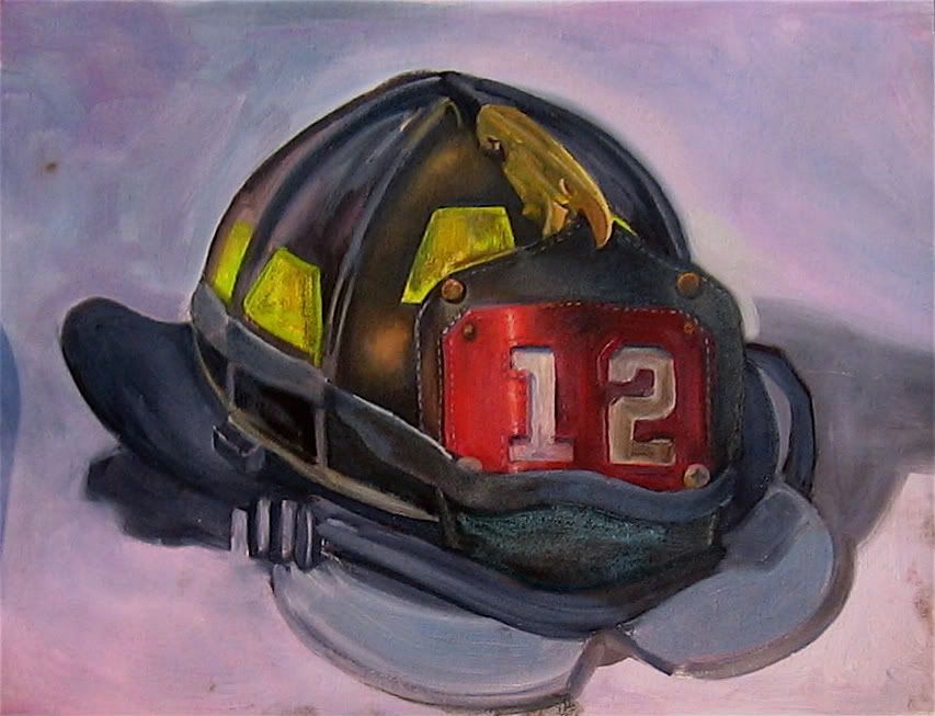 This is a painting representing Mike Mullan's Helmut. I will post pictures of the painting as I work to complete it. He is one of the Firefighters that I worked with at 12 Truck. Mike passed away on 09/11/01 along with several other Firefighters from my house. I have approched my Instructor at the NY Academy of Art about having different artists paint a helmut for the each of the 343 Firefighters who passed away on Sept. 11th. The pieces would be exhibited all at once as a tribute to the Firefighters and their families. I am just starting to get this organized and will keep you informed as to the progress of the project with additonal posts.
